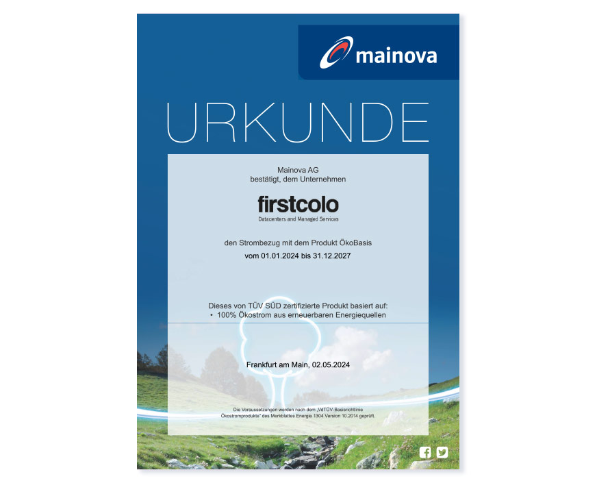 Dank der Auszeichnung ÖkoBasis von der Mainova AG wird für die firstcolo Rechenzentren der Betrieb zu 100 % Ökostrom aus erneuerbaren Energien versichert.